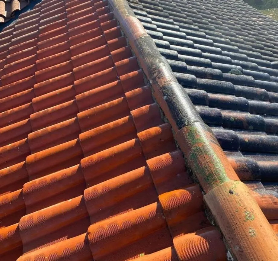 Avant/après spectaculaire d’un chantier de nettoyage de toiture réalisé en Gironde. Grâce à notre intervention, la maison retrouve son éclat tout en étant protégée pour les années à venir.
